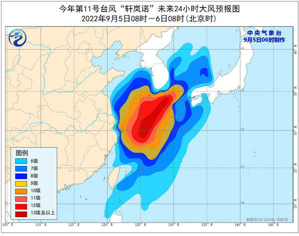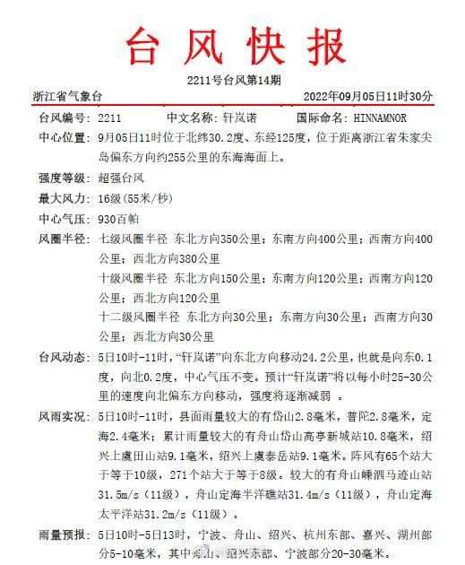 9月5日中午,超强台风“轩岚诺”在我省东北部近海(东经125度附近)转向东北方向移动。12时,“轩岚诺”中心位于舟山市朱家尖岛偏东方向约275公里的海面上,将以每小时25-30公里的速度向北偏东方向移动,强度缓慢减弱,从下午开始逐渐远离我省。