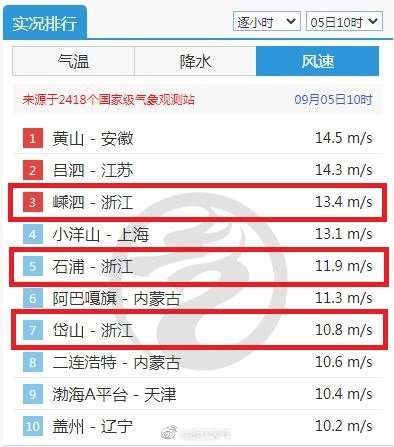 截至今日10时,受“轩岚诺”的影响,在全国降水和风速排行榜上,这些地方榜上有名。(@浙江天气)