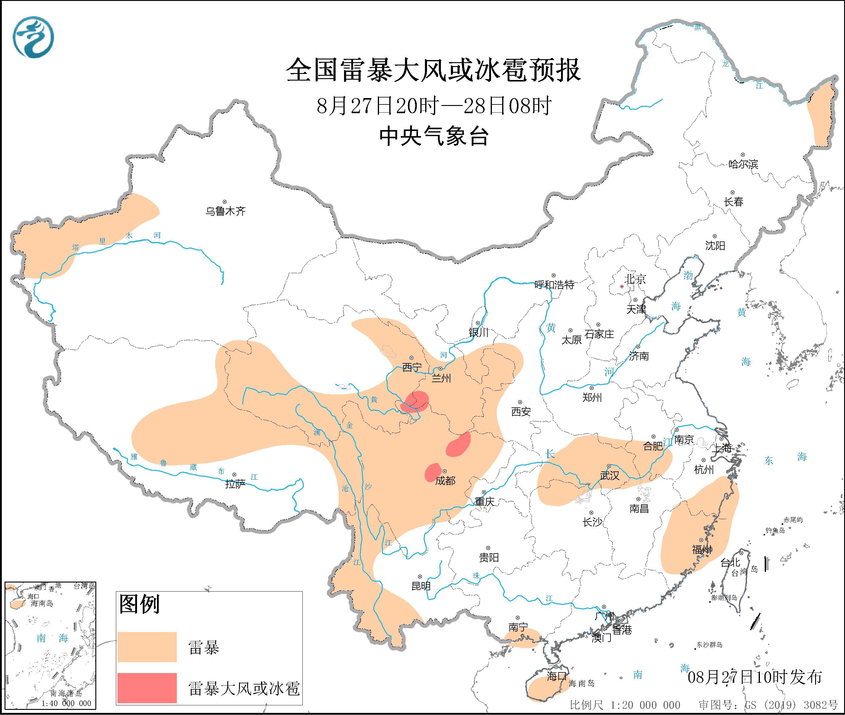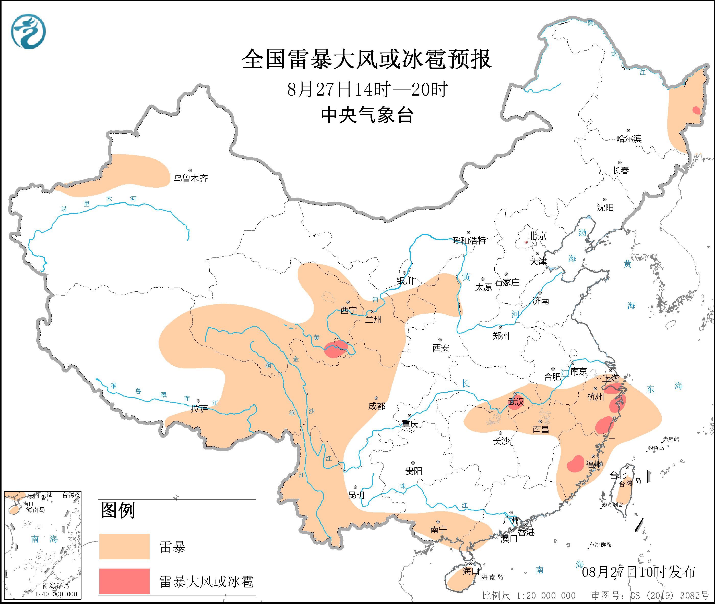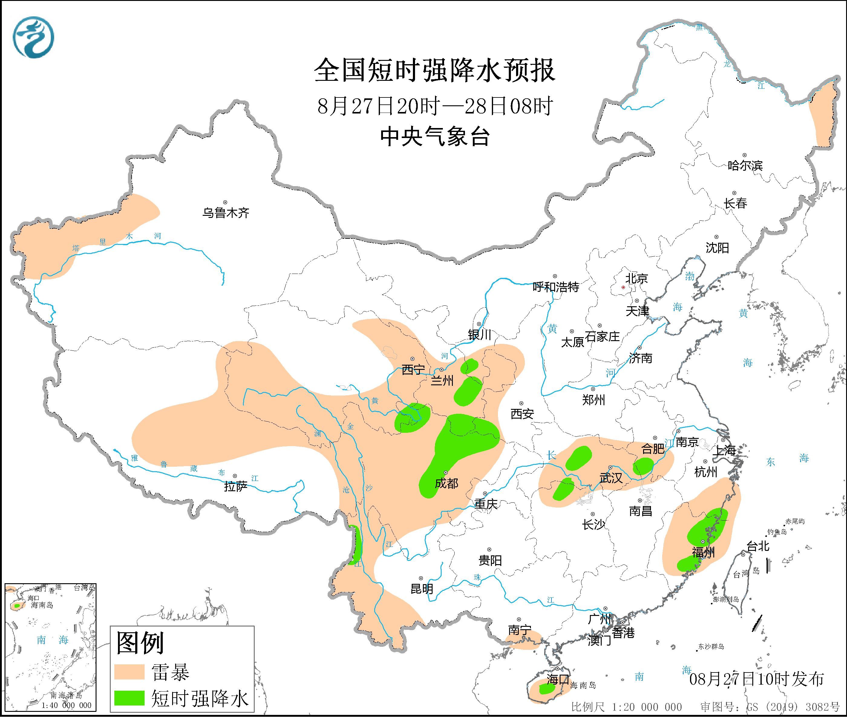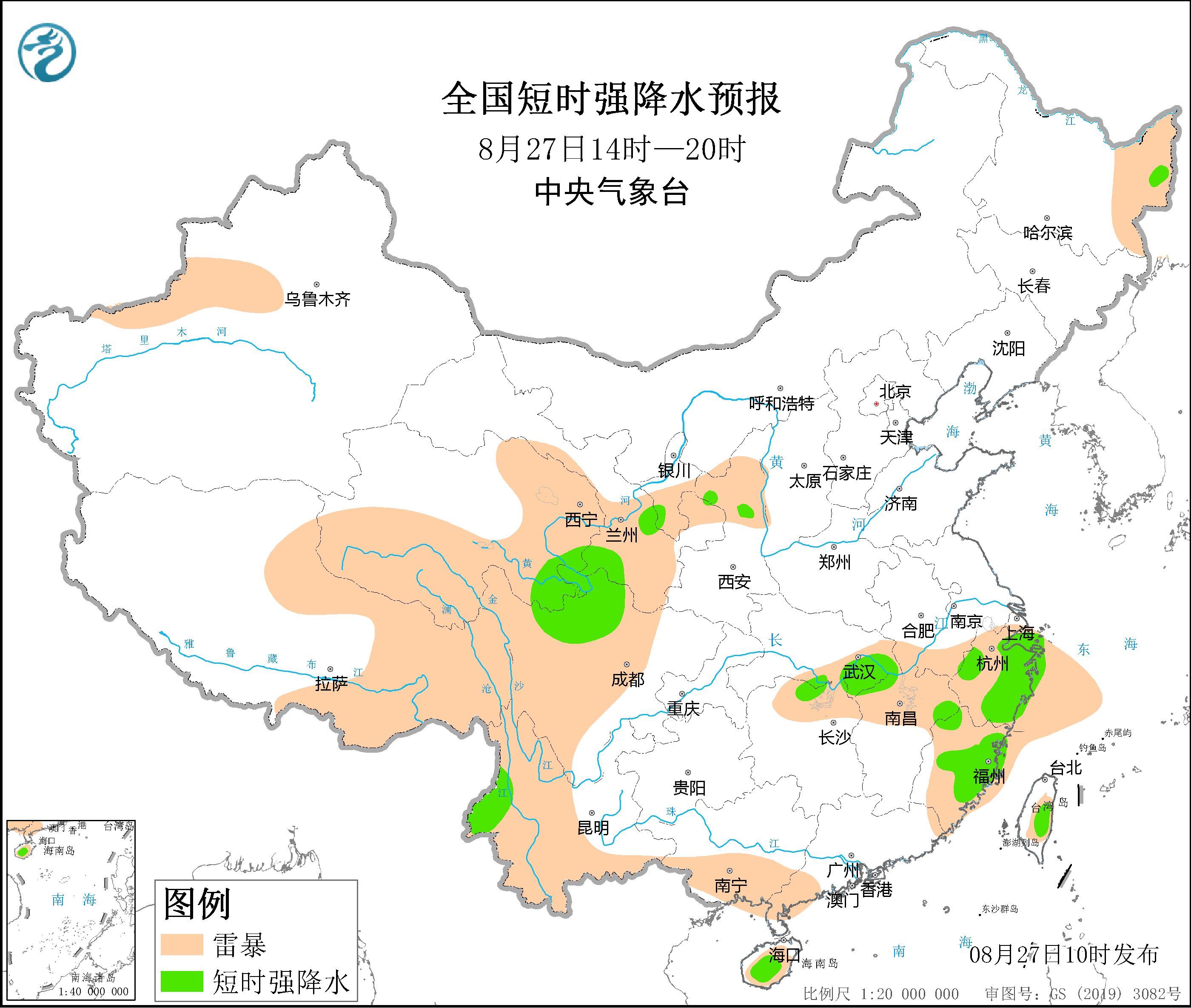 预计8月27日14时至28日08时,青海东南部、甘肃东南部、陕西北部和南部、安徽中部、湖北中东部、湖南北部、江西东北部、浙江、福建东部、四川中东部和北部、云南西部、海南岛中部等地的部分地区将有短时强降水天气,小时雨量20-50毫米,局地可达60毫米以上;另外,青海东南部、甘肃东南部、湖北东部、浙江东部、福建东南部、四川北部和东部等地的局地将有雷暴大风或冰雹天气。